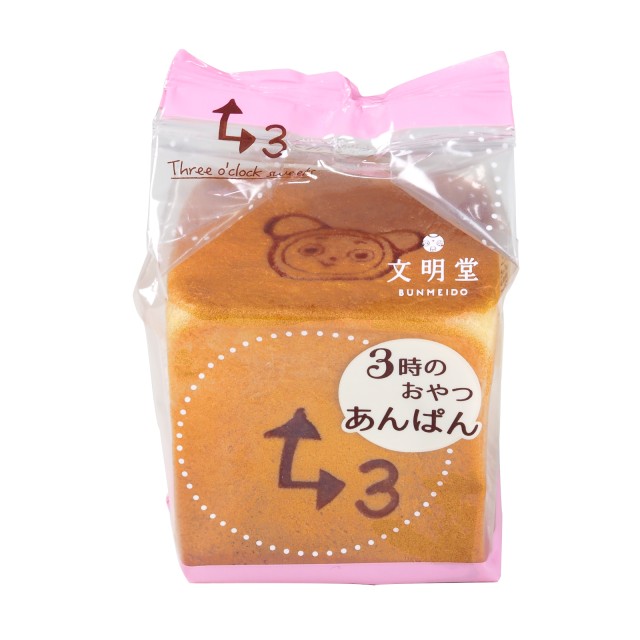 北海道産の大納言小豆を炊き上げたつぶ餡をぎっしり詰めた、可愛らしい手のひらサイズのあんぱんです。文明堂のキャラクター『カンカンベア』と3時をお知らせする『時計』の焼き印が押されています。