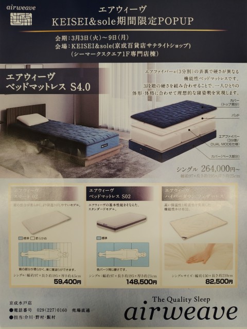 「睡眠の質は寝具で変わる」 エアウィーヴの優れた耐圧分散と高い復元性で、肩や腰への負担を軽減し、朝までの熟睡をサポートします。 様々な種類の「エアウィーヴ」をお試しいただきながら、お客様の快眠のために、最適な寝具選びをお手伝いいたします。